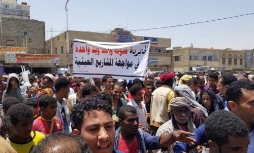 وطالب المحتجون بإطلاق سراح الصحفيين جميل الصامت، وجميل الشجاع، والناشط عبدالله فرحان، المختطفين في السجون السرية للمليشيا.