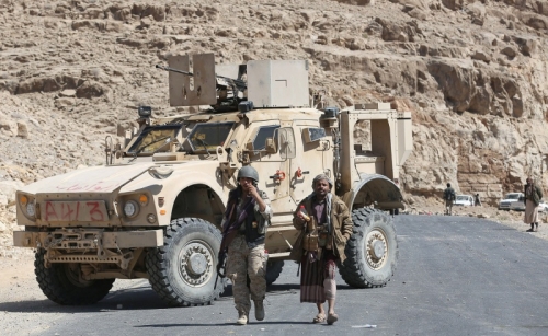 مقاتلان من الحلفاء المحليين في اليمن امام عربة عسكرية سعودية في محيط مأرب - ارشيف