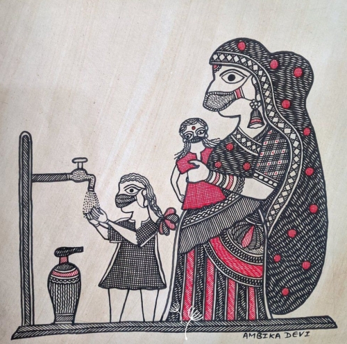 وقامت أمبيكا ديفى، وهى فنانة من قرية راشدبور فى ولاية بيهار الشمالية، باستخدام أصباغًا طبيعية للون لرسم صور توضيحية على جدران المنازل، فهى قامت بتصوير يرتدون أقنعة الوجه ويحافظون على التباعد الاجتماعى فى أسواق القرية.
