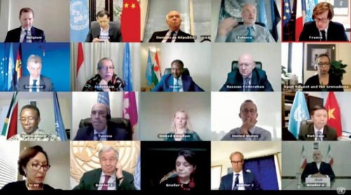 اجتماع عبر الفيديو بين أعضاء مجلس الأمن حول الملف الإيراني بحضور غوتيريش أمس (الأمم المتحدة)