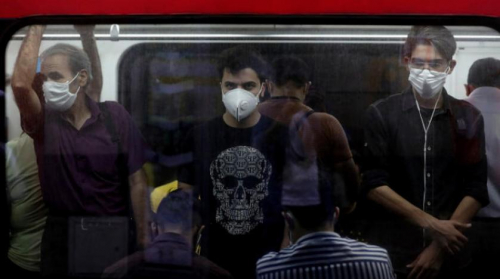 أشخاص يضعون كمامات في قطار بطهران