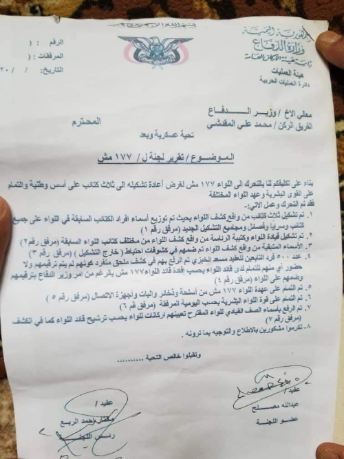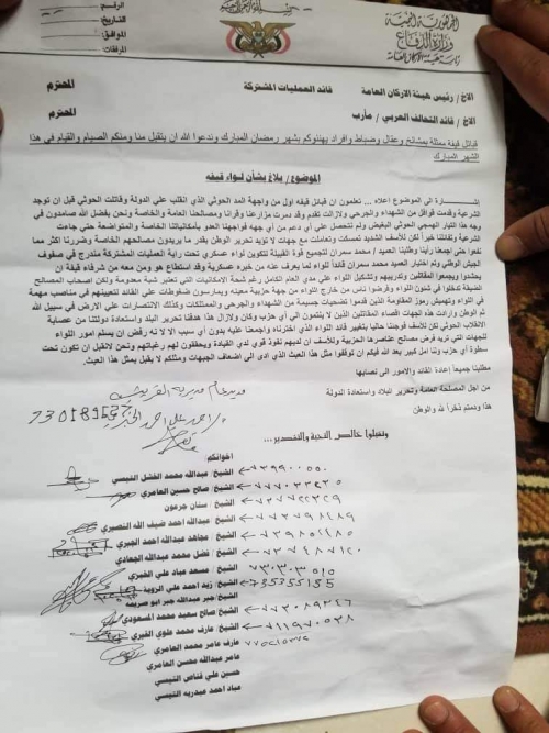 واكدت قبائل قيفة في رسالتها الموجهة الى رئيس هيئة الاركان العامة وقائد قوات التحالف العربي. مشيرة الى ان نفوذ حزب الاصلاح وسعيه للسيطرة على لواء قيفة واستبعاد قائد اللواء الوطني الذي جمع وحشد المقاتلين. يراد به استفراد حزب الاصلاح باللواء ونهب الياته وقواته وتجميده مثل بقية الالوية وربما تسليمه لمليشيا الحوثي.