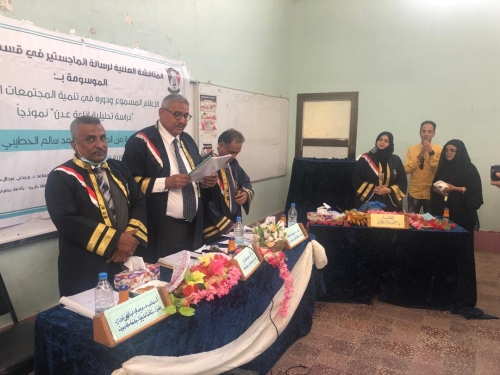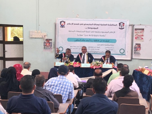 تحصلت الباحثة رنا أحمد سالم الحطيبي على درجة الامتياز بالماجستير عن رسالتها العلمية الموسومة بـ :الاعلام المسوع ودوره في تنمية المجتمعات المحلية "دراسة تحليلة إذاعة عدن "انموذجا ، وذلك في قاعة قسم الاعلام بكلية الآداب جامعة عدن .