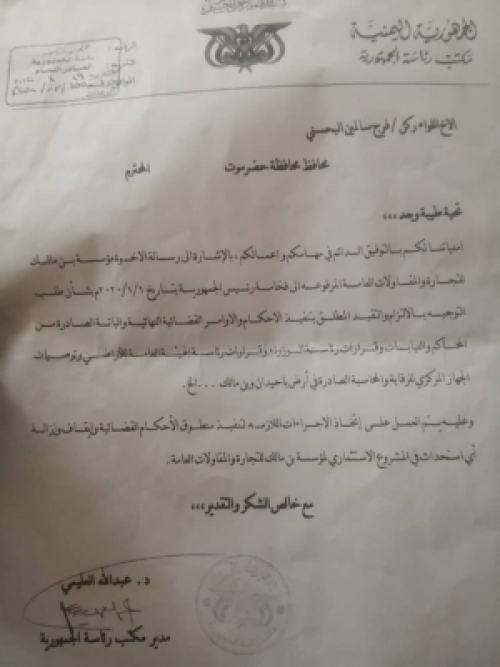 بالوثائق| "مكتب الرئاسة".. كيف أستغل النفوذ في أراضي حضرموت؟