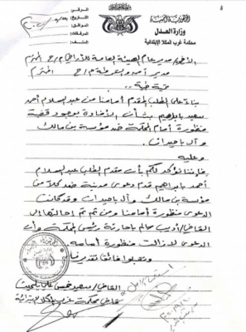 ومن جانبه أكد القاضي سعيد خميس علي بلبحيث، قاضي محكمة غرب المكلا الابتدائية في مذكرة صادرة عنه بتاريخ 10 - 9 - 2020 موجهة إلى كل مدير عام الهيئة العامة للاراضي م / ح، ومدير أمن والشرطة م / ح، وجود قضية منظورة أمام المحكمة.