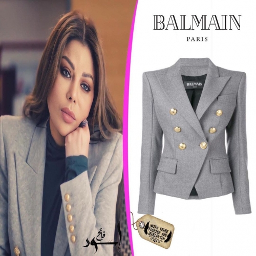 وارتدت هيفاء وهبي سترة "بلايزر" باللون الرمادي تزيّنت بأزرار ذهبيّة بتوقيع دار Balmain وكذلك معطف من الجوخ باللون الأخضر من Isa Arfen نسّقته مع حقيبة يد باللون نفسه من Mark Cross.