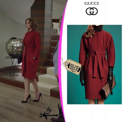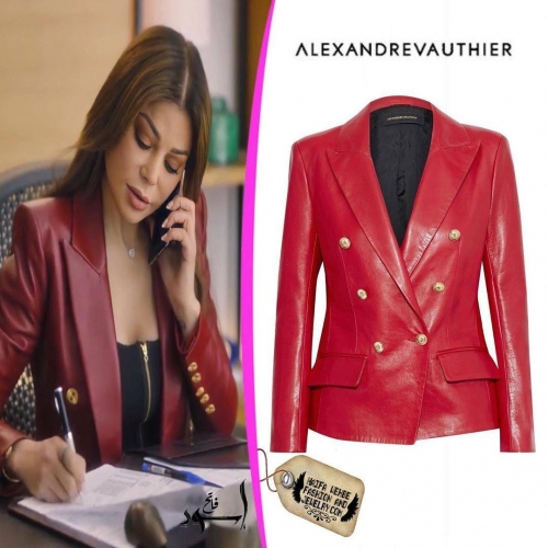 الفنانة ارتدت كذلك سترة "بلايزر" من الجلد الأحمر تزيّنت بأزرار ذهبيّة بتوقيع دار Alexandre Vauthier، إضافة إلى أنها ظهرت بقميص من الحرير الأحمر بتوقيع Balenciaga تميّزت بياقتها العالية وكمّيها الطويلين، وقد نسّقتها مع أقراط كبيرة من Chanel. وأطلت بمعطف من الجوخ باللون الأحمر الداكن من Gucci نسّقته مع حذاء "ستيليتو" أسود وحقيبة يد باللون نفسه.
