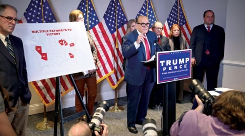 تمسك رودي جولياني رئيس الفريق القانوني للرئيس دونالد ترمب، بادعاءات حدوث تزوير ممنهج في الانتخابات الرئاسية الأميركية، مؤكداً أن التزوير لم يحدث فقط في ولاية واحدة بل في عدة ولايات «بأسلوب ونمط واحد».