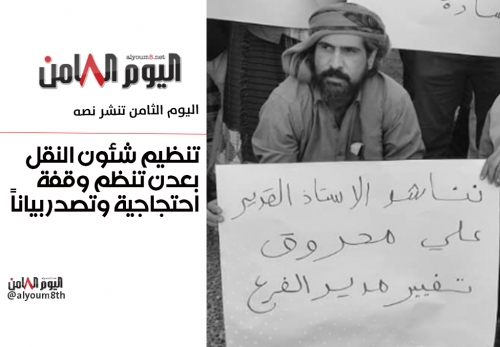 إلى نائب رئيس الوزراء القائم بأعمال وزير النقل والاستاذ محافظ العاصمة عدن والاستاذ رئيس الهيئة العامة لتنظيم النقل البري، نحن موظفو الهيئة العامة لتنظيم شؤون النقل فرع عدن نرفض رفضا قاطعا للأعمال الرعناء التي يقوم بها القائم بأعمال مدير الفرع والتي أدت لتعطيل عمل الفرع وإيقاف إيراداته وخلق الصراعات في العمل واقصاء وتهميش وتهديد وإيقاف رواتب بعض العمال لغرض التجويع والتركيع ويقوم بعمل تدمير ممنهج لفرع عدن لمصالح شخصية.