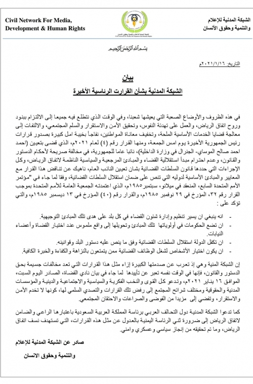اعربت الشبكة المدنية للإعلام والتنمية وحقوق الإنسان عن خيبة أملها إزاء القرارات الرئاسية الأخيرة، معتبرة ذلك إخلالا بالدستور اليمني والسياسات الناظمة لاتفاق الرياض.