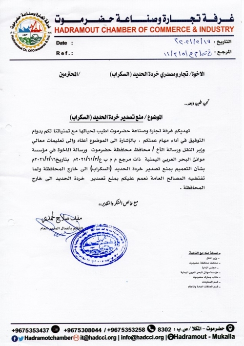 تهديكم غرفة تجارة وصناعة حضرموت أطيب تحيتها مع تمنيتها لكم بدوام التوفيق في أداء مهام عملكم، بالإشارة الى الموضوع أعلاه والى تعليمات معالي وزير النقل ورسالة الأخ/ محافظ حضرموت ورسالة الأخوة في مؤسسة مواني البحر العربي ذات المرجع 319/م ح /2021 المؤرخة في 9 /2 /2021م، بشأن التعميم بمنع تصدير خردة الحديد ( السكراب ) الى خارج المحافظة لما تقتضيه المصالح العامة نعمم عليكم بمنع تصدير خردة الحديد الى خارج المحافظة .
