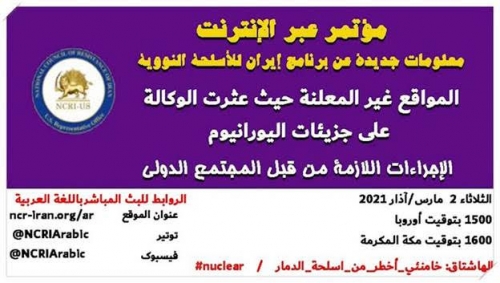 معلومات جديدة عن أحد المواقع غير المعلنة حيث عثرت الوكالة على جزئیات اليورانيوم الإجراءات اللازمة من قبل المجتمع الدولي في مؤتمر عبر الإنترنت سيُعقد يوم الثلاثاء 2 مارس / آذار الساعة 3 مساءً بتوقيت أوروبا (14 لندن، 9 واشنطن)، سيقدم المجلس الوطني للمقاومة الإيرانية معلومات جديدة حول موقع لم يعلن عنه نظام الملالي وحيث مفتشو الوكالة الدولية للطاقة الذرية وجدوا جزيئات اليورانيوم. تم الحصول على هذه المعلومات عبر مصادر شبكة مجاهدي خلق الإيرانية داخل النظام.