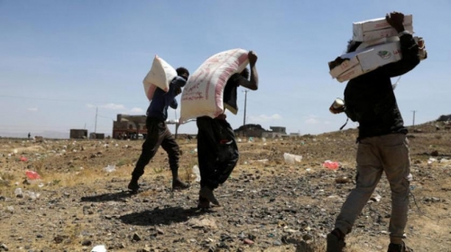 يمنيون يحملون مساعدات إغاثية في صنعاء