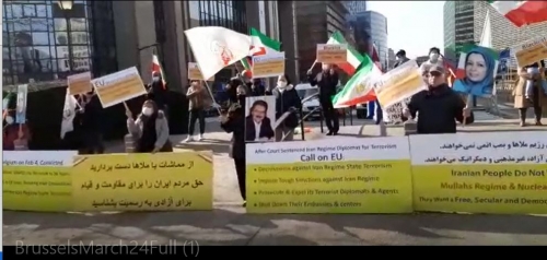 وحث الإيرانيون في مسيرتهم الاحتجاجية في بروكسل الاتحاد الأوروبي على محاسبة النظام الايراني على دعمه ورعايته للإرهاب، وانتهاكاته الفظيعة لحقوق الإنسان، وتطوير برنامج الصواريخ البالستية، وسعيه المستمر للحصول على الأسلحة النووية.