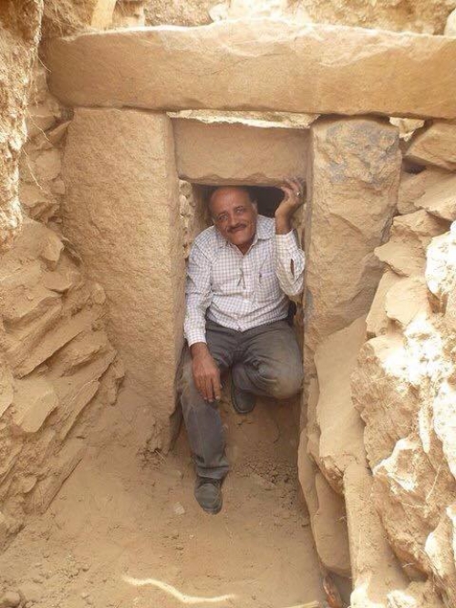 الباحث الجنوبي الدكتور علي صالح الخلاقي لحظة تفقده النفق الأثري (المصدر)