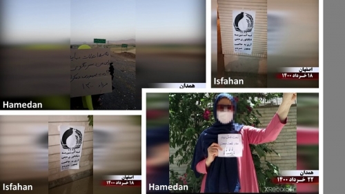 المنتفضون يصنعون النصر"، و"مسعود رجوي: انتفاضة الشعب الإيراني نهاية نظام ولاية الفقيه واللصوص ومغتصبي سيادة الشعب "، و"مسعود رجوي: أفعى ولاية الفقيه لا تلد حمامة في الانتخابات"، و"لا" لانتخابات النظام، نعم لانتخابات حرة وجمهورية ديمقراطية"، و"تصويتي للإطاحة، نعم لجمهورية ديمقراطية"، و"الموت لخامنئي، الموت لرئيسي، قاتل 1988، نعم لجمهورية ديمقراطية"، و"الموت لخامنئي، الموت لرئيسي والتحية لرجوي"، و"نحن رجال ونساء النضال نتحداك في النضال"، و"الديمقراطية والحرية مع مريم رجوي".