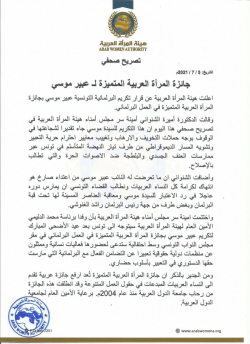 واختتمت امينة سر مجلس أمناء هيئة المرأة العربية بأن وفدا برئاسة محمد الدليمي الأمين العام لهيئة المرأة العربية سيتوجه الى تونس بعد عيد الأضحى المبارك لتكريم عبير موسي بجائزة المرأة العربية المتميزة في العمل البرلماني في مقر مجلس النواب التونسي وسط احتفالية ستدعى لحضورها فعاليات نسائية وممثلون عن منظمات دولية حقوقية تعبيرا عن التضامن الفعال مع البرلمانية التي مارست حقها الدستوري في التعبير بأسلوب حضاري.