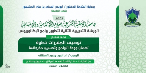 اختتمت جامعة الوسطية الشرعية للعلوم الإسلامية والإنسانية في شِعب الإمام المهاجر بسيئون الأثنين الموافق 5 يوليو 2021م الورشة التدريبية الثانية لتطوير برامج البكالوريوس ، المنفذة برعاية الموجه العام لأربطة التربية الإسلامية ورئيس جامعة الوسطية الشرعية الحبيب العلامة د. أبوبكر العدني بن علي المشهور.