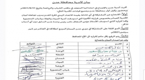 ورد ذلك في البيان الذي صدر صباح عن رؤساء أندية العاصمة عدن برئاسة الأخ/ عرفات محمد علي قاسم مدير مكتب الشباب والرياضة بعدن و بحضور الأخ/ محمد نصر شاذلي وكيل أول محافظة عدن وقيادة أنديتنا العشرة (التلال ,الوحدة ,الشعلة ,شمسان، الميناء ،الروضة ،شباب المنصورة ،الجلاء ،الجزيرة) الذي نص على عدم المشاركة في الدوري اليمني الممتاز لكرة القدم المقرر إنطلاقه منتصف شهر سبتمبر ،كما طالب المجتمعون بتسليم نسخة من البيان لمحافظ محافظة عدن .