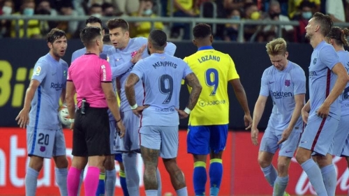 طرد دي يونغ (الثاني من اليمين) خلال مباراة برشلونة وقاديش