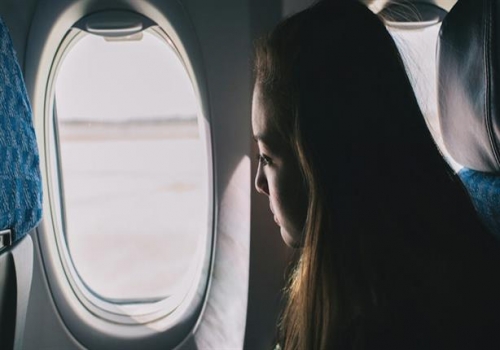 فتاة حسناء تنظر من نافذة الطائرة المحلقة في السماء - أرشيف