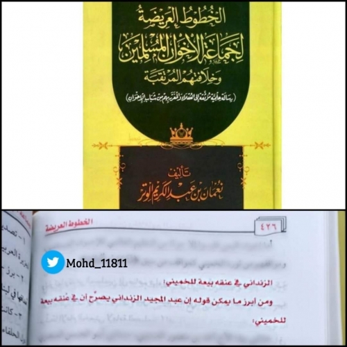 -وقد صرح بعض قيادات الإخوان المسلمين: أنهم بايعوا الخميني كما في كتاب «الخطوط العريضة لجماعة الإخوان المسلمين» : أنّ عبدالمجيد الزنداني -أحد كبار مؤسسي جماعة الإخوان المسلمين في اليمن- يقول: " إن في عُنقي بيعة للخميني!".
