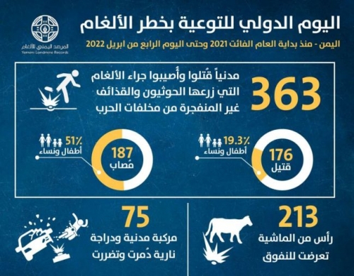 ووثق المرصد اليمني للألغام خلال الفترة منذ بداية العام الفائت 2021، وحتى اليوم الرابع من أبريل 2022، مقتل وإصابة 363 مدنيا بينهم نساء وأطفال جراء الألغام الأرضية والعبوات الناسفة والذخائر غير المنفجرة من مخلفات الحرب في مناطق واسعة من البلاد على النحو التالي: