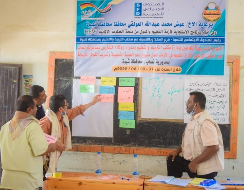 دشن الصندوق الاجتماعي للتنمية فرع المكلا صباح اليوم الدورة التدريبية للعاملين بمكتب التربية ومدراء ووكلاء المدارس على الدليل الإرشادي لإدارة التعليم في الأزمات بمديرية نصاب محافظة شبوة وذلك برعاية محافظ محافظة شبوة/عوض محمد عبدالله العولقي ضمن اطار برنامج الاستجابة لأزمة التعليم والممول من منحة الحكومة الالمانية (KFW)، وبالتنسيق مع مكتب التربية والتعليم بالمحافظة.