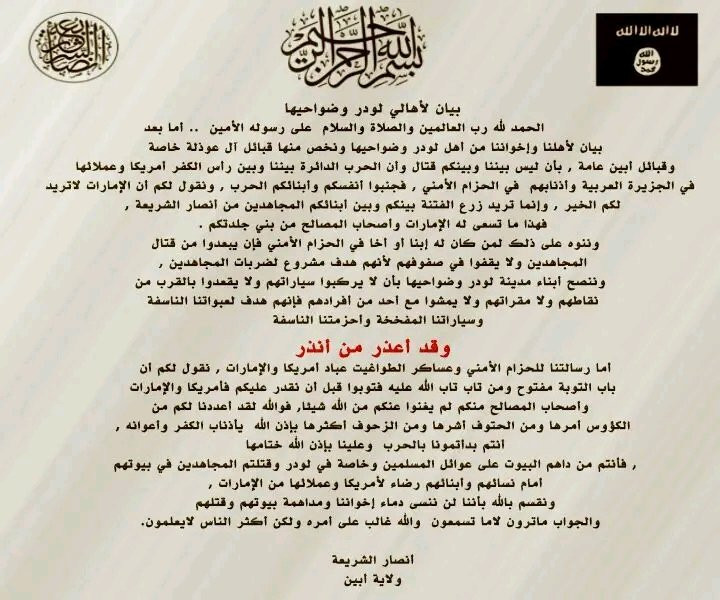 وطالب تنظيم أنصار الشريعة في ثاني بيان له قبائل "العواذل خاصة"، وأبين عامة بالوقوف على الحياد في معركة، قال انها ضد من وصفهم بطواغيت أمريكا والإمارات.. متوعدا قوات الحزام الأمني في لودر بحرب بالعبوات الناسفة والسيارات المفخخة والانتحاريين، محذرا افراد القبائل من الاقتراب من ثكنات القوات المحسوبة على المجلس الانتقالي الجنوبي الذي يسعى لتحقيق الاستقلال واستعادة الدولة الجنوبية السابقة.