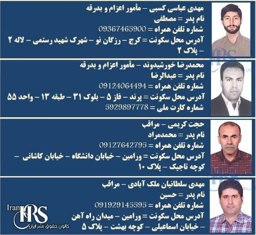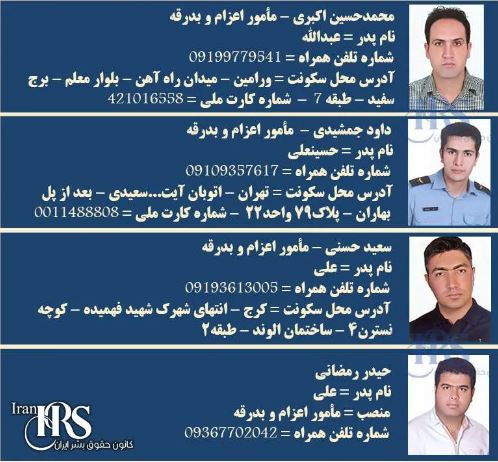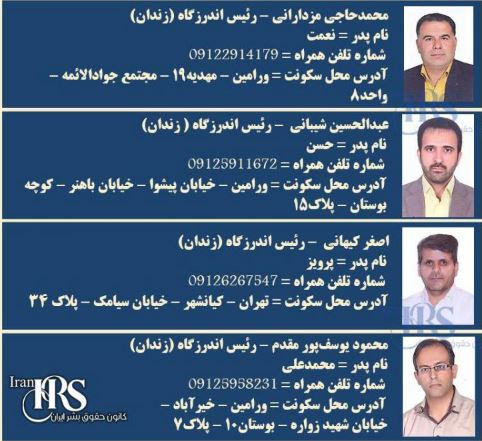 من ناحية أخرى، قام موقع المركز الإيراني لحقوق الإنسان الأربعاء 29 أبريل 2022 بعد سلسلة الكشف عن السجانين ومحترفي التعذيب الآن بنشر بعض البيانات والتفاصيل من بينها رقم الهاتف والعنوان والرمز الوطني لهؤلاء الجلادين في هذا الكشف عن محترفي التعذيب بسجن طهران الكبرى بالإضافة إلى الأسماء والصور.