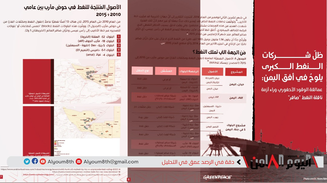 "غرينبيس الشرق الأوسط وشمال أفريقيا، كشفت عن ما اسمته بالستار عن شركات النفط الضخمة وراء خزّان صافر العائم"
