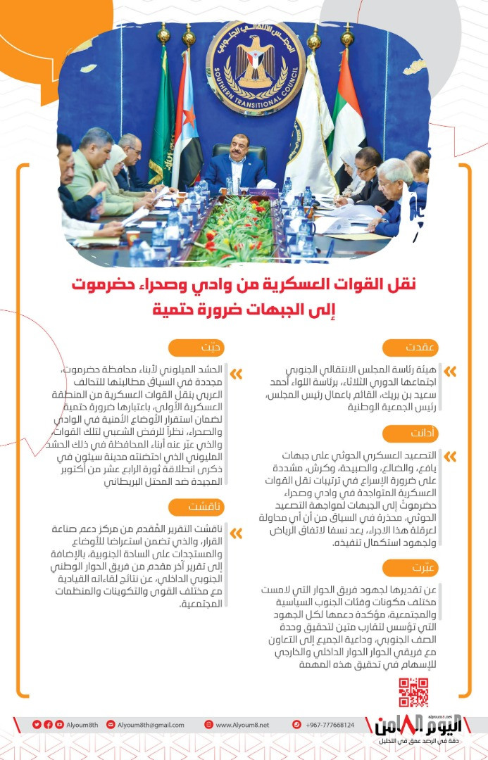 وحيّت هيئة الرئاسة في مستهل الاجتماع، الحشد الميلوني لأبناء محافظة حضرموت، مجددة في السياق مطالبتها للتحالف العربي بنقل القوات العسكرية من المنطقة العسكرية الأولى، باعتبارها ضرورة حتمية لضمان استقرار الأوضاع الأمنية في الوادي والصحراء، نظراً للرفض الشعبي لتلك القوات، والذي عبّر عنه أبناء المحافظة في ذلك الحشد المليوني الذي احتضنته مدينة سيئون في ذكرى انطلاقة ثورة الرابع عشر من أكتوبر المجيدة ضد المحتل البريطاني.