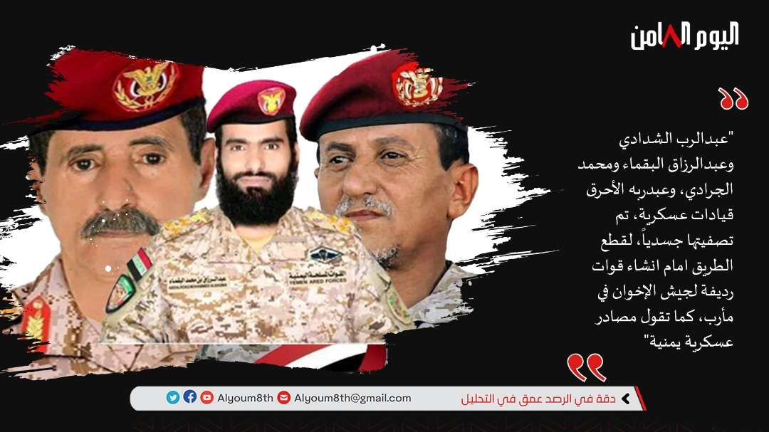 "عبدالرب الشدادي وعبدالرزاق البقماء ومحمد الجرادي، وعبدربه الأحرق قيادات عسكرية، تم تصفيتها جسدياً، لقطع الطريق امام انشاء قوات رديفة لجيش الإخوان في مأرب، كما تقول مصادر عسكرية يمنية"