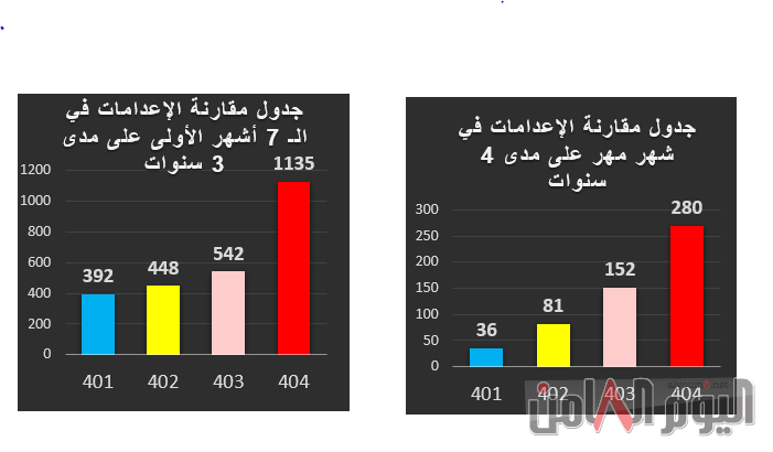 هذه البيانات تكشف عن صعود حاد في وتيرة تطبيق حكم الإعدام: فقد ارتفعت أعداد المفارقين للحياة خلال العام ٢٠٢٥ بقرابة ١١٠٪ مقارنة بالفترة نفسها من العام الماضي، إذ بلغت أعداد الإعدامات ٥٤٢ في الأشهر الأولى من ١٤٠٣، مقارنةً بـ١١٢٥ في الفترة المماثلة من ١٤٠٤ حسب حسابات المعارضة. كما كانت زيادة سنوية كبيرة على سجل ١٤٠٣ نفسه؛ فقد وثق المجلس الوطني للمقاومة الإيراني أنه جرى تنفيذ ١٬١٥٣ إعدامًا في العام ١٤٠٣ (مارس ٢٠٢٤–مارس ٢٠٢٥)، أي بزيادة ٤٢٪ عن ٨١٥ إعدامًا في ١٤٠٢.
