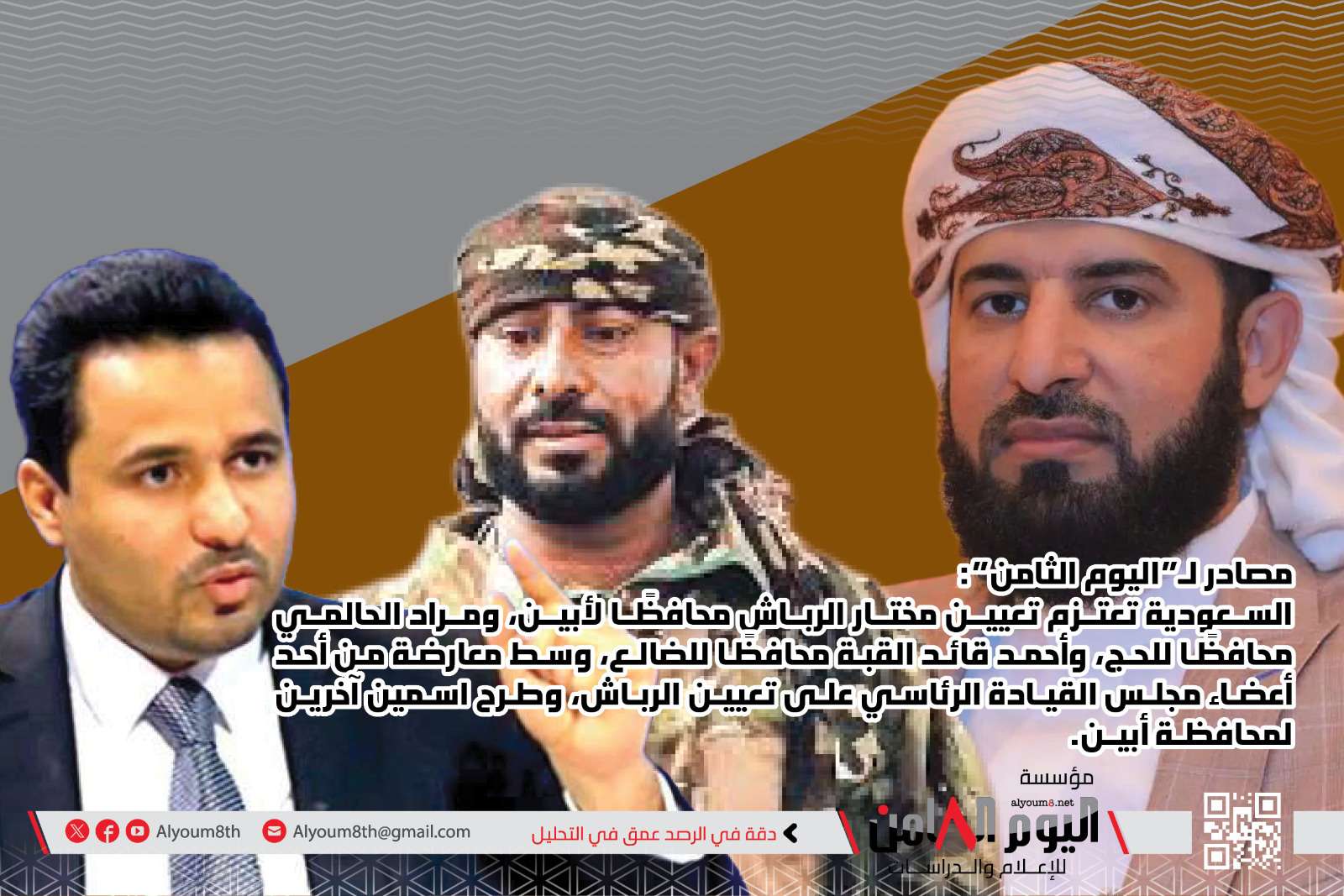 كشفت مصادر يمنية مطلعة لـ"اليوم الثامن" عن ترتيبات سعودية لإجراء تغييرات في قيادة عدد من المحافظات الجنوبية، تتضمن تعيين مختار الرباش محافظًا لأبين، ومراد الحالمي محافظًا للحج، وأحمد قائد القبة محافظًا للضالع، في إطار تحركات أوسع لإعادة ترتيب المشهد السياسي والعسكري في الجنوب.