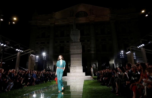 وفي ختام العرض سارت العارضات برفقة ريجوني إلى درج المبنى الأثري لبورصة ميلانو الذي استخدمت واجهته في عرض ضوئي للمصمم الألماني إنجو مورر.